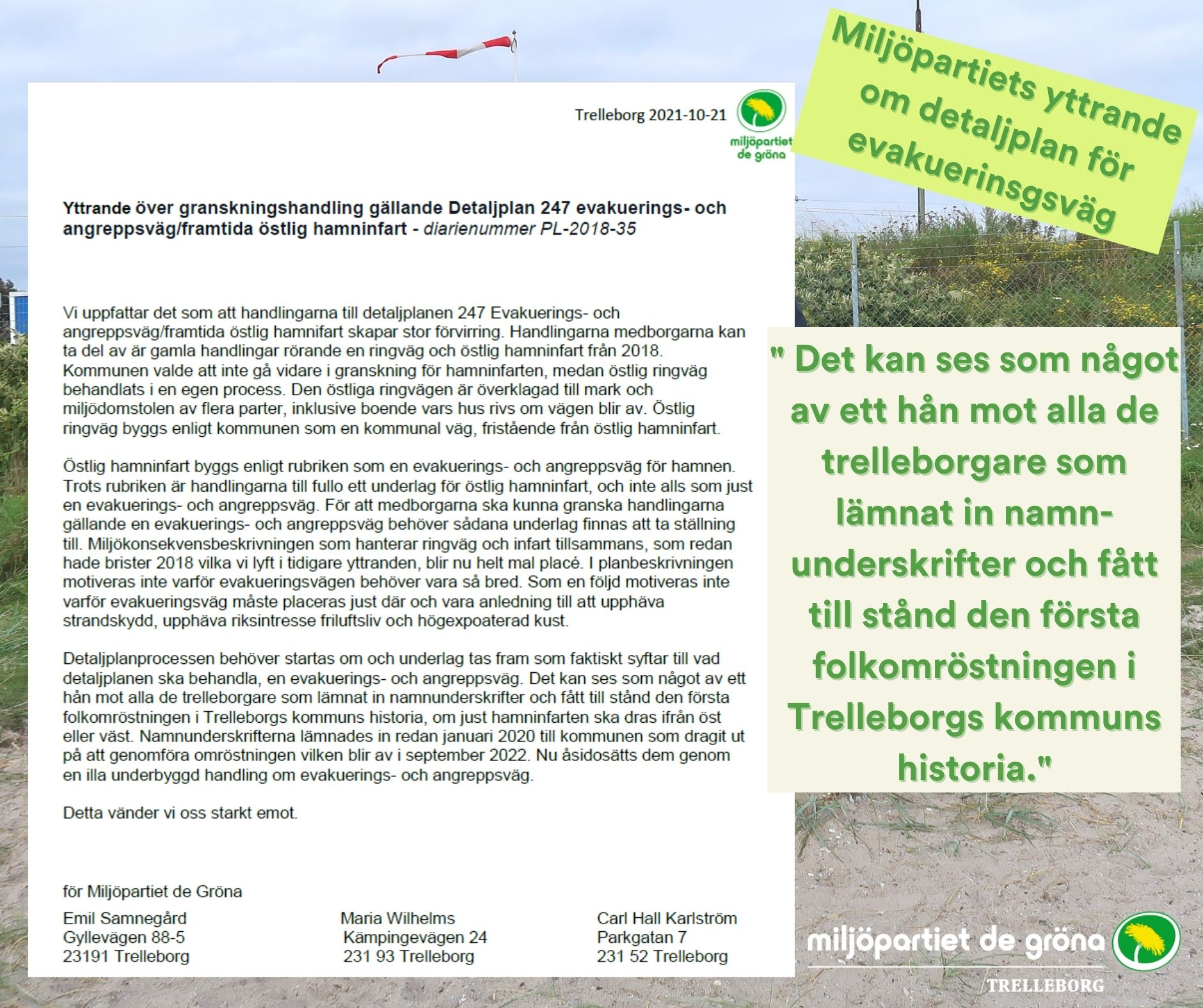 Styret har döpt om den östra hamninfarten till en evakueringsväg och försöker skynda fram beslutet innan Trelleborgarna fått säga sitt. I januari 2020 lämnades det in en namninsamling för folkomröstning kring infarten till hamnen. Trelleborgs kommuns första folkomröstning någonsin. Först på valdagen 2022 får Trelleborgarna säga vad de tycker men redan nu försöker styret forcera fram en östlig hamninfart med dåligt underbyggda handlingar. Därför lämnar Miljöpartiet ett yttrande med brister som vi ser i processen.