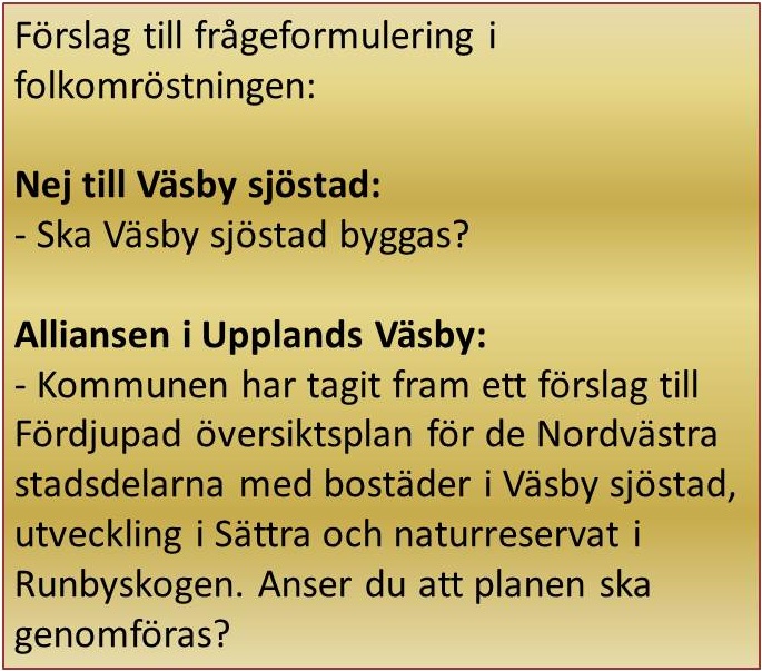 Miljöpartiet är mycket kritiskt till den frågeformulering som nu kommer att gälla. Frågan är lång, komplex och säkert svår att förstå för många. Den är inte neutral utan innehåller positivt värdeladdade ord som "utveckling" och "naturreservat". Den är direkt manipulativ när den försöker inbilla Väsbyborna att man måste rösta ja för att få ett naturreservat i Runbyskogen samtidigt som man vill förstöra den del av skogen som har den mest värdefulla naturen. Läs mer om kritiken mot alliansens fråga på Nej till Väsby sjöstads hemsida