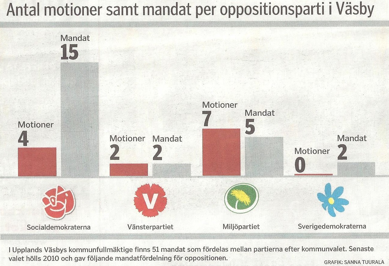 Miljöpartiet är det oppositionsparti som lämnat flest motioner till kommunfullmäktige och också fått flest bifallna, enligt en artikel i Vi i Väsby. Bland annat om måltidsprogram, vindkraftverk och partiövergripande skolsatsning.