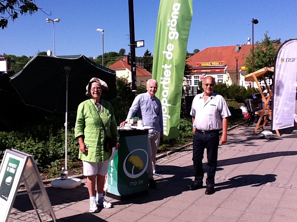 Ovan: Medlemmarna Eeva Kaplas, Lars Valtersson och Kjell Johnsson vid Miljöpartiets stånd på Väsbyfestivalen. I bakgrunden Upplands Väsby station.