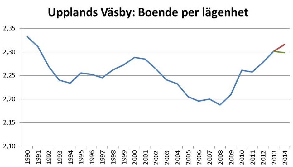 1. Skatteinkomstprognoserna byggde på att invånarantalet i kommunen skulle öka med 850 under 2014. Nu visar det sig att ökningen troligen bara blir ca 500. Det gör att skatteinkomsterna för 2015 (som bygger på invånarantalet året innan) blir ca 23 miljoner kronor lägre än i alliansens sista budget. Huvudorsaken till detta är att det i denna budget optimistiskt räknats med att den förtätning av boendet (genomsnittligt antal boende per lägenhet i kommunen) som pågått de senaste åren skulle fortsätta i oförändrad takt, se den röda linjen för 2014 i kurvan ovan. Detta visar sig nu vara ett överoptimistiskt antagande. Som kurvan visar har perioder med utglesning och förtätning i bostadsbeståndet regelbundet avlöst varandra och det finns ingen garanti för att en pågående trend fortsätter. Det visar sig nu också att kurvan 2014 åter planat ut och kanske börjat vända nedåt?
