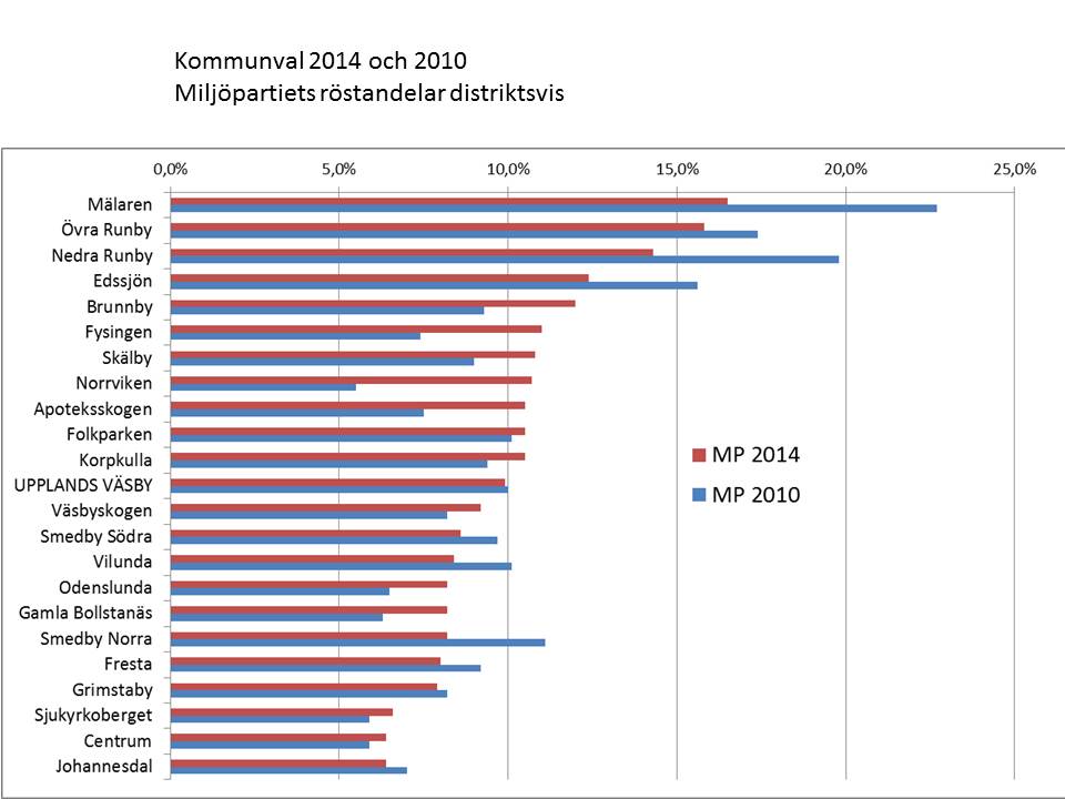 Jämförelse av Miljöpartiets röstandelar distriktsvis 2014 och 2010: