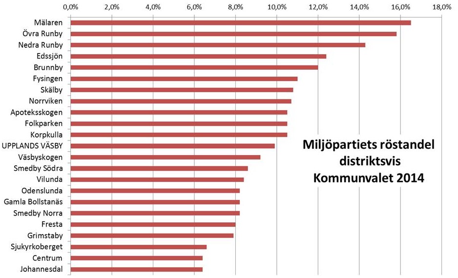 Miljöpartiets största stöd finns liksom tidigare i de västra kommundelarna. Röstandelen minskade dock jämfört med 2010, vilket troligen beror på att många borgerliga väljare då röstade på Miljöpartiet kommunalt för att markera sitt missnöje med planerna på Väsby sjöstad. I år hade man chansen att uttrycka detta missnöje i en särskild folkomröstning och tyckte sig då kunna rösta på sitt vanliga parti igen i kommunvalet.