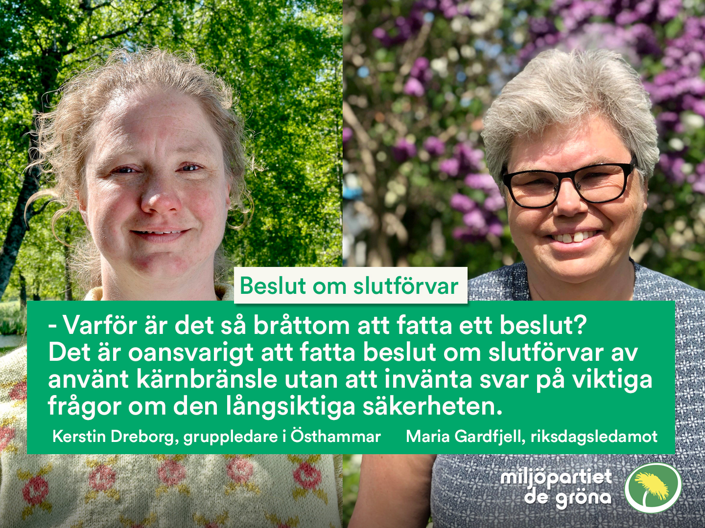 – Att kärnavfallet ska förvaras på ett säkert sätt är det ingen som ifrågasätter. När forskare säger att kopparhöljet kan korrodera blir jag oerhört orolig, därför måste metoden förbättras innan ett avfallslager kan byggas, säger Maria Gardfjell, riksdagsledamot för Miljöpartiet i Uppsala län.