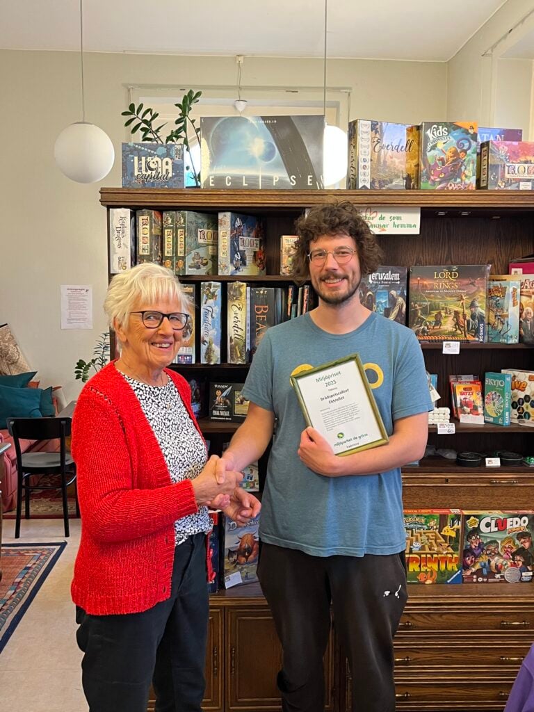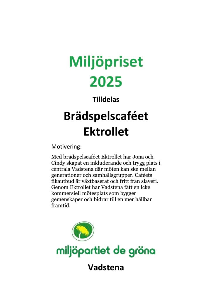 Vad roligt att få uppmärksamma lokala brädspelscaféet Ektrollet med Miljöpartiet i Vadstenas miljöpris 2025. Vår ordförande Eivor Folkesson delar på bilden ut diplomet till Jona Ekenberg som driver Ektrollet tillsammans med sin fru Cindy Kempe.