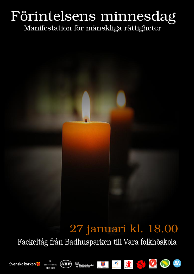 Den 27/1 2016 är alla hjärtligt välkomna att delta på Förintelsens minnesdag. Vi utgår från Badhusparken kl. 18.00 och går i fackeltåg till Vara folkhögskola.