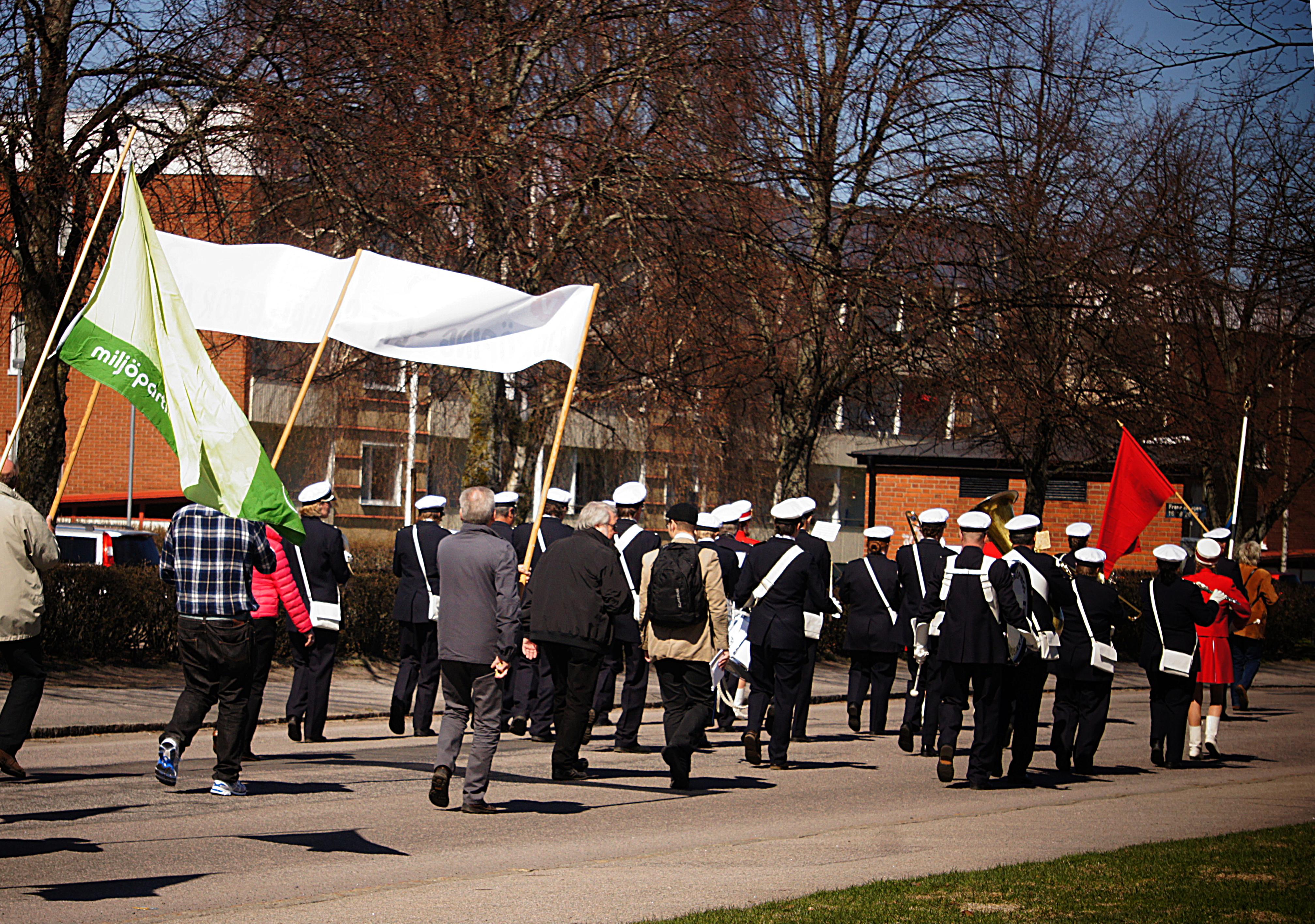 Första maj och äntligen den årliga vandringen till Folkets Park. Solweig Andersson, Filip Hallbäck och Mikael Zetterström anslöt sig till de övriga från Miljöpartiet de gröna i Lidköping.
