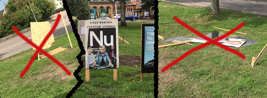 Vi har vid några tillfällen fått frågan om varför vi inte har affischer vid vägkanten ”som alla de andra”. I grund och botten finns det tre anledningar. Vi avviker gärna från normen, vi tycker att affischskogarna är skräpiga och slutligen så innebär det att vi inte behöver jobba med att affischerna ska vara hela och snygga. Samma bevekelsegrunder som inför valet 2014 då vi inte heller använde affischer.