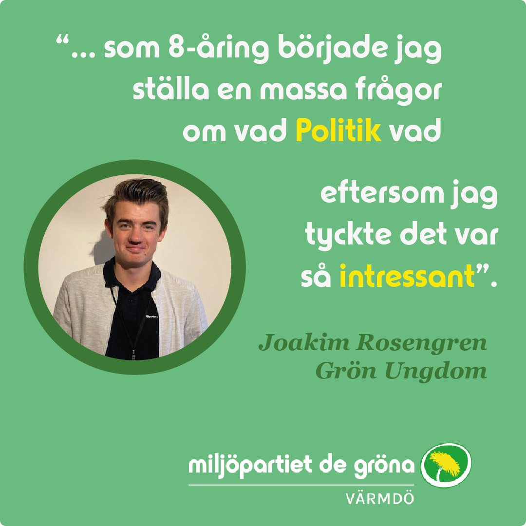 Joakim Rosengren, 15 år, är MP Värmdös yngsta medlem. Men trots sin unga ålder har han flera år på nacken inom politiken. I den här intervjun delar han med sig av sin passion för politik, sin beundran för Gustav Fridolin, hopp och oro inför framtiden och drömmen om att en dag bli utbildningsminister.