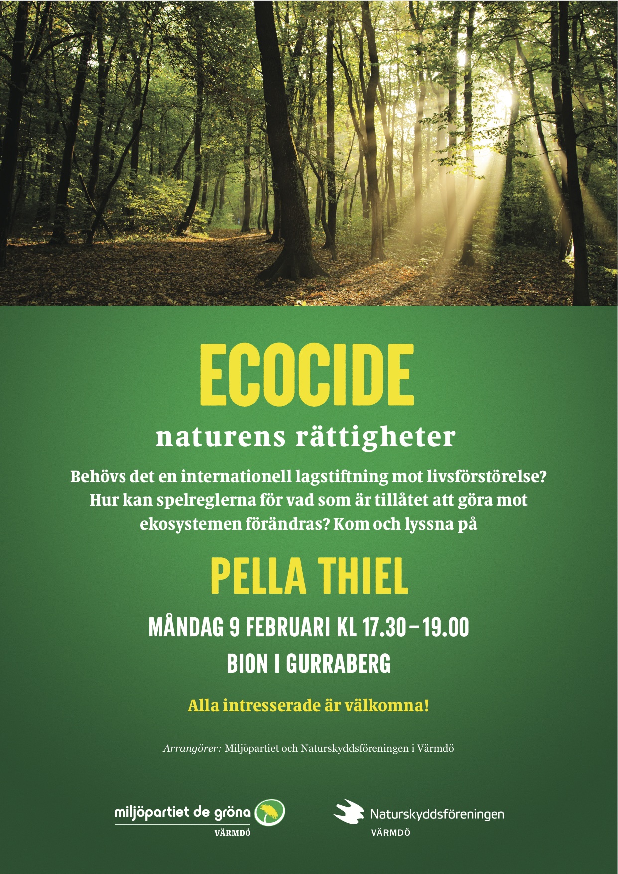 Vi lever i en tid av artutrotning och förstörelse av ekosystem, och behovet av nya förhållningssätt blir allt tydligare. Hur kan spelreglerna för vad som är tillåtet att göra mot ekosystemen förändras? Pella Thiel arbetar för en internationell lagstiftning mot livsförstörelse, tilsammans med många andra världen över.